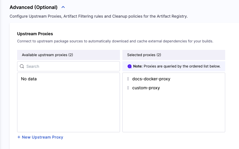 - Under Selected proxies, you will see an ordered list of selected proxies for this registry. When the registry receives a request, the proxies will be queried in order from top to bottom.