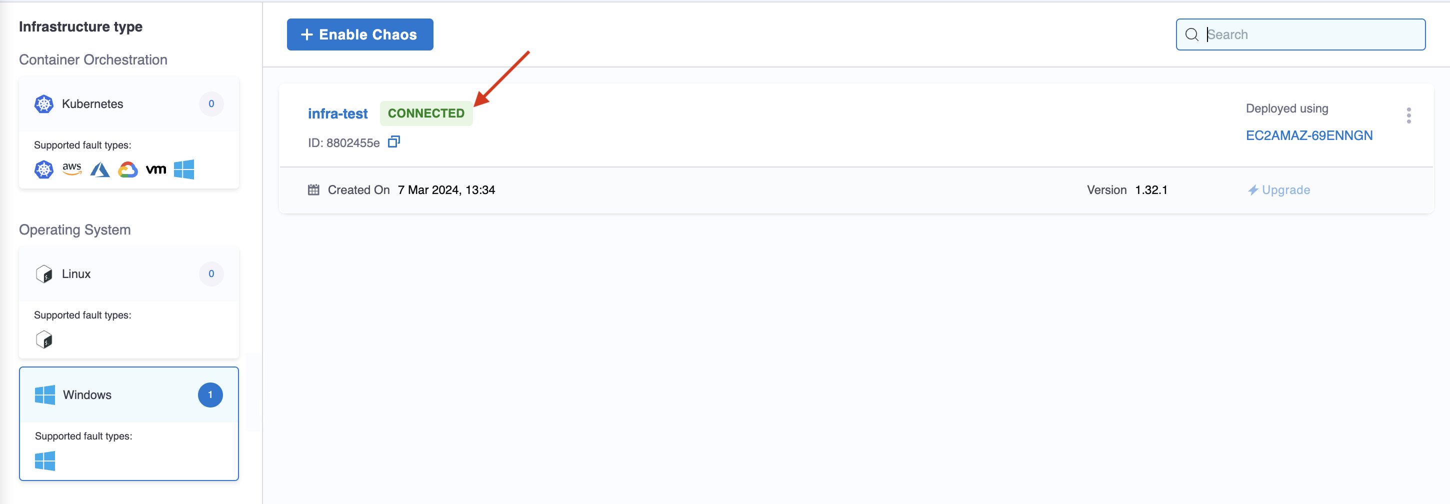 Navigate to Chaos Experiments -> Environment. Select New environment and create an environment and install or upgrade chaos infrastructure. To enable chaos in an existing environment, click the environment.