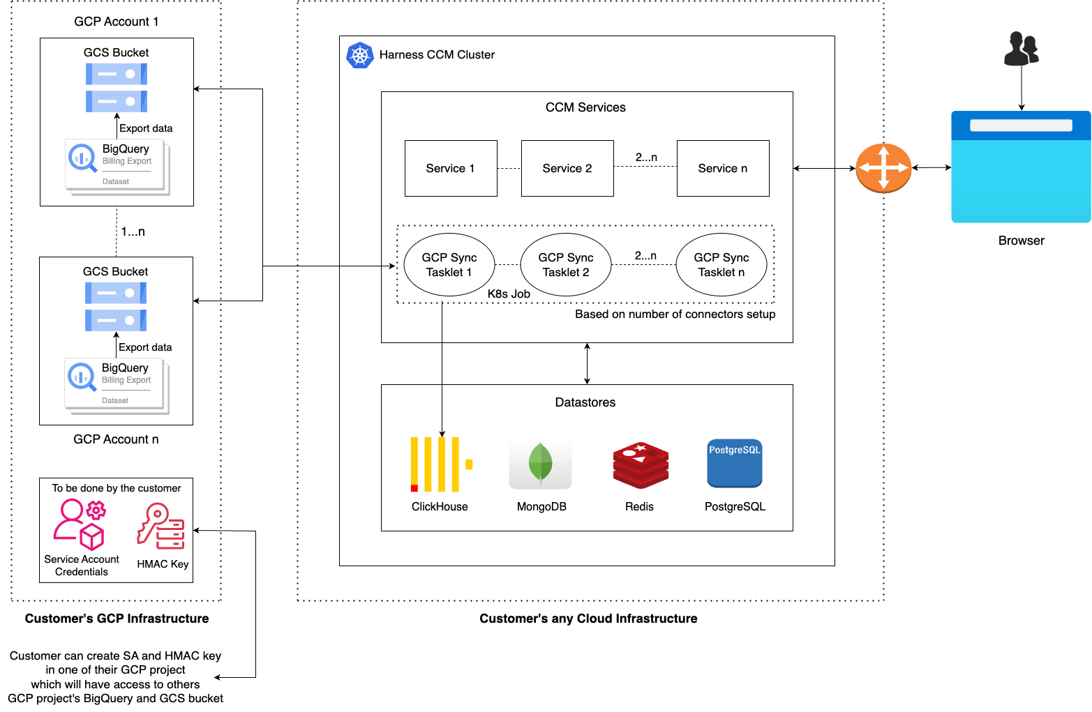 A GCP service account is needed to be able to authenticate and perform operations on the customer’s BQ and GCS buckets.You will need one SA and its JSON key during onboarding.